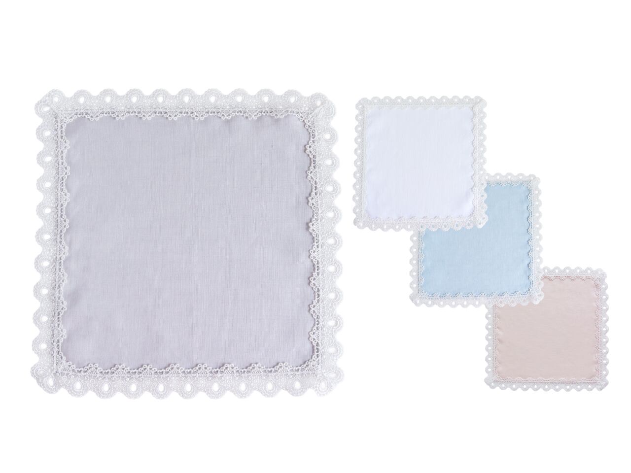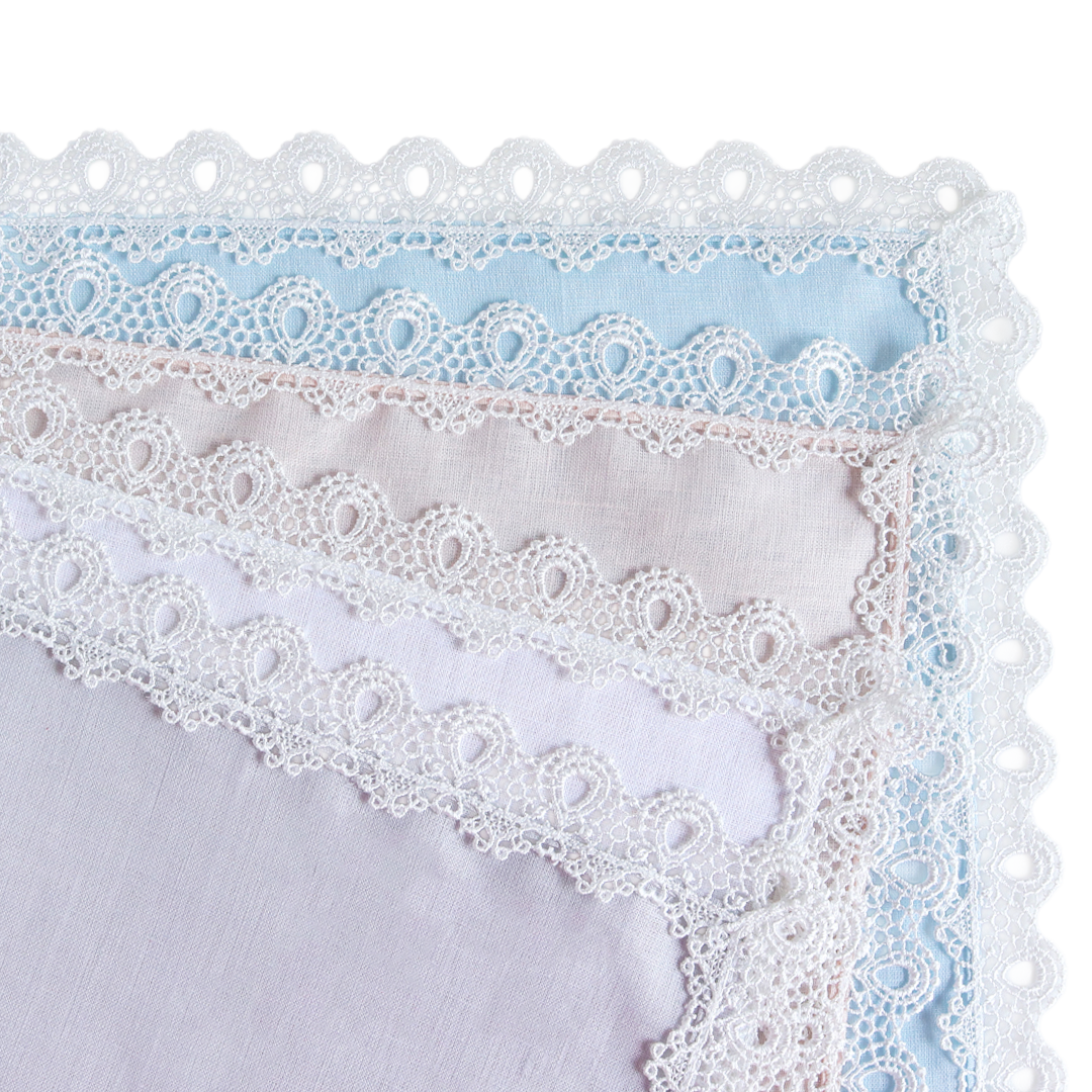 「ミニヨン」は、レースの中に“しずく”や“ハート”のモチーフを忍ばせた、やさしく上品な定番タオルハンカチです。