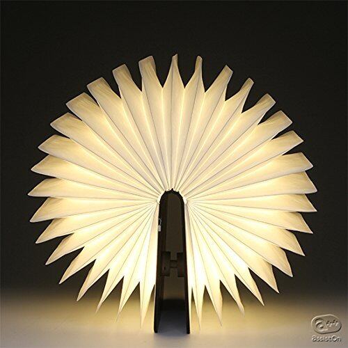本を開くとマジックのように幻想的な光が広がり、明るく優しい光を放つ高性能なLEDを搭載した充電式ライトです。360度に開き、オレンジ色のマイクロUSBケーブル、取り付け用の磁気木製ペグ、吊り下げのための美しいレザーストラップが付属しています。工芸品のような繊細なレザーカットを施した木による仕上げで、インテリアとしても美しい作品です。